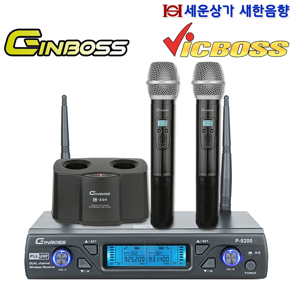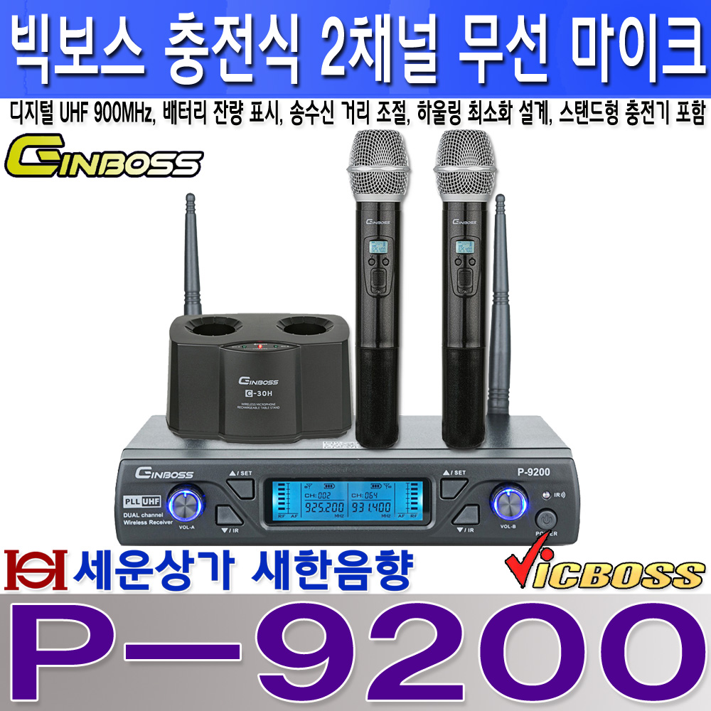 P-9200 빅보스 충전식 무선 마이크 2채널 900MHz, 하울링 최소화, 충전 크래들 포함, 빅보스P9200 2채널 무선 마이크