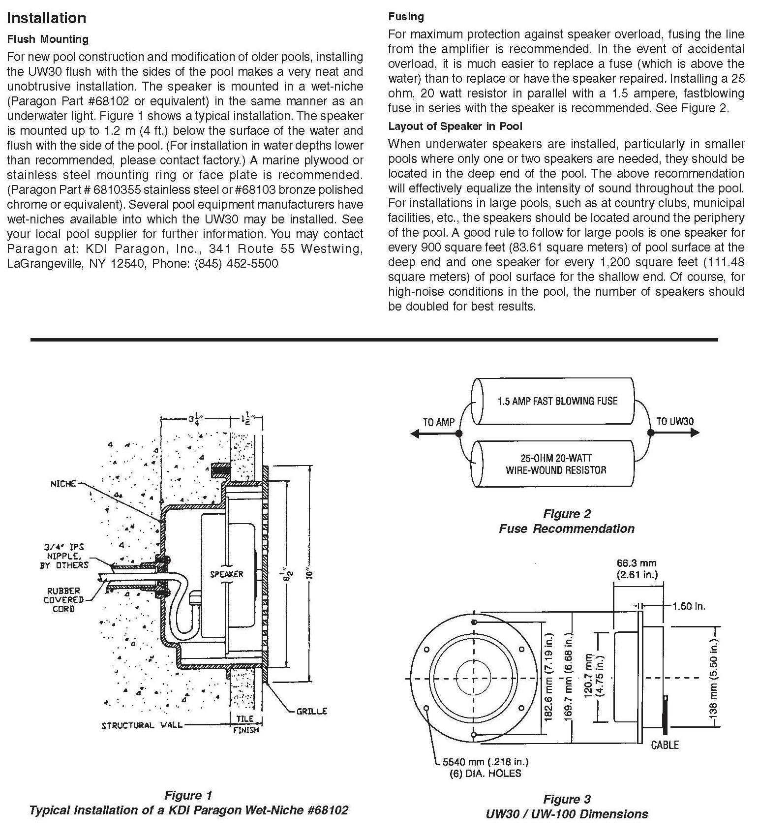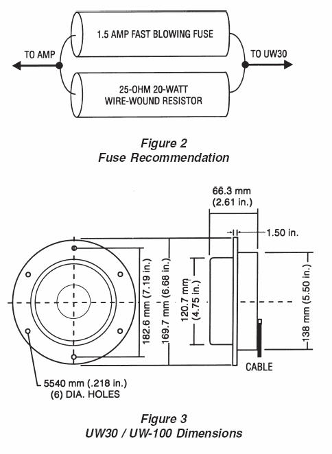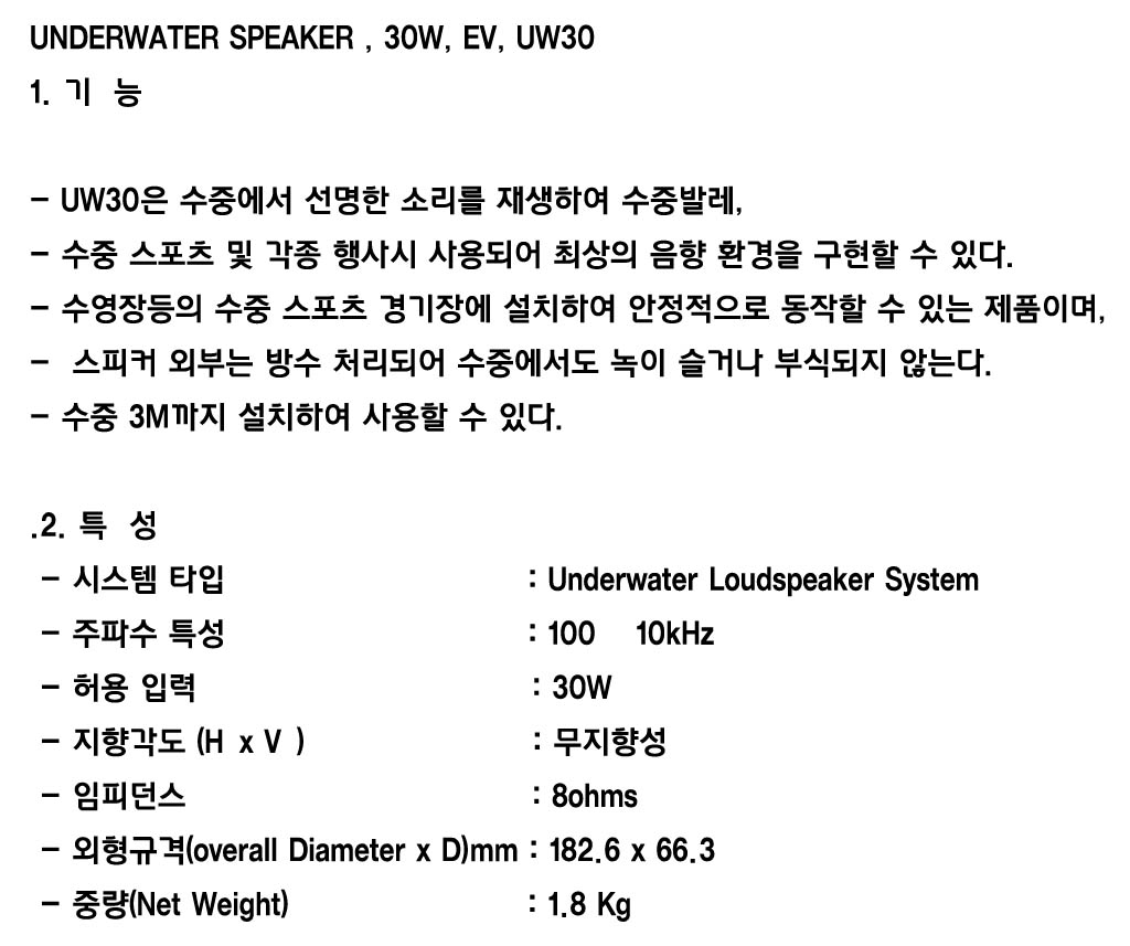 - 적정한 크기의 풍풀장에 균일한 음방사 염분에 강한 수중 스피커 - 독특하고 특허를 가진 설계에 의한 사운드 트랜스듀서로서 케이스의 구조적인 인클로져. - 수중 스피커는 대중 전달적인 행사, 고급 리조트 풀장 및 싱크로 나이즈 수영, 올림픽 경기 풀장 등 사용. - 수중 발레와 유사한 수중 쇼에 사용 - UW30은 낮은 디스토션의 고음질을 가지며 수중 음악 효과를 위해 사용 - UW30의 외부 케이스는 충격에 강한 ABS로 만들어져 있고 색상은 풀장과 같은 파란 색상 - 모든 내부 부품은 담수. 또는 바닷가의 해수 풀장 등에서 사용할 수 있도록 hot melt과정을 통해 밀봉됨. - 수중에서 UW30의 방사 거리는 10m x 10m - 제품의 설치 깊이는 3미터 이하이며 1.2미터 정도의 깊이에 설치하길 추천 - 과부하 보호를 위해 직렬로 스피커에 25옴 20W저항과 2.5암페어 용단이 빠른 휴즈를 연결하여 사용