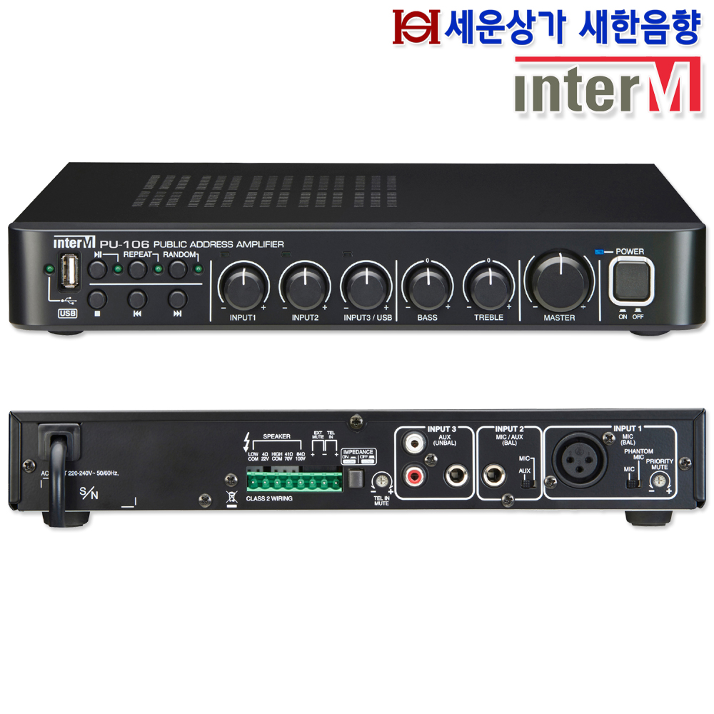 PU-106 인터엠 USB 플레이어 내장 소형 디지털 앰프 60W, 콤팩트 사이즈, 우선 방송, 뮤트 기능, 마이크 팬텀 파워 기능, PU106