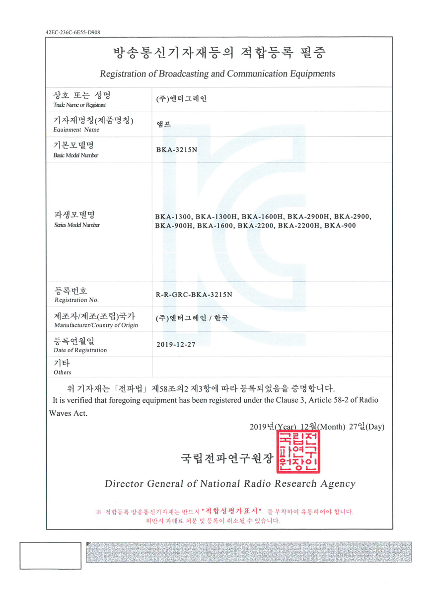 - 방송 통신 기자재 인증 번호 : MSIP-REM-GRC-BKA-3215